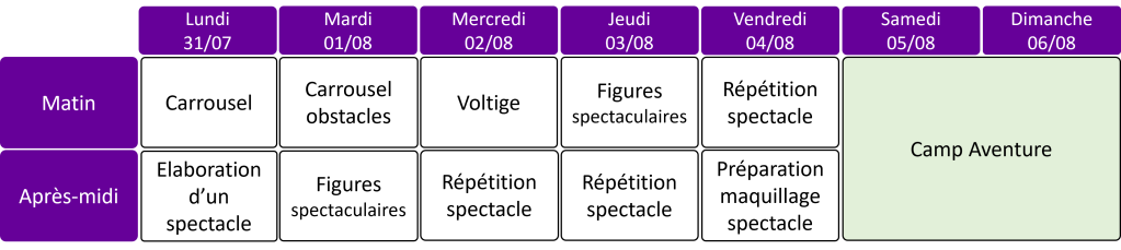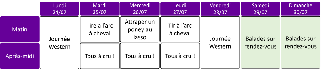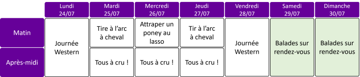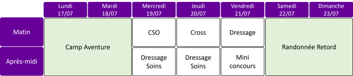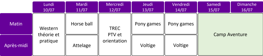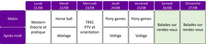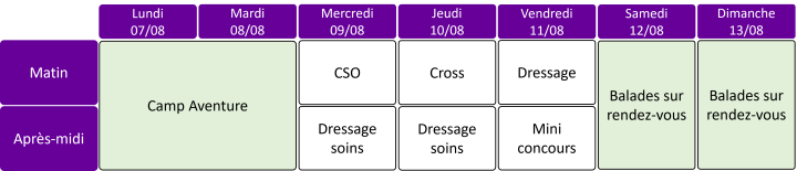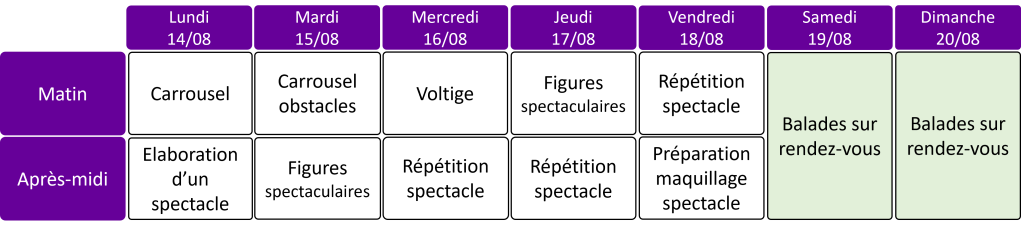 Les stages sont de 9h30à 12h et de 14h à 16h30. Les stagiaires peuvent manger sur place (repas à prévoir) ou rentrer chez eux et revenir. Tout les stages sont accessibles pour tout les niveaux, hormis les CSO, dressage et cross qui sont à partir du galop 4. Il faut être à l'aise aux trois allures pour les randonnées de deux jours et camps aventures. les balades sont possibles le soir à 17h sur rendez vous.