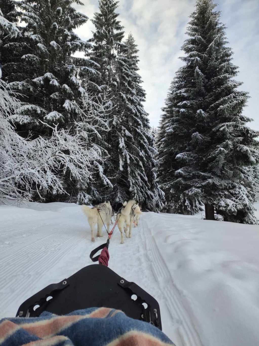 Passagers dans le traîneau tracté par les chiens, vous contemplerez les paysages enneigés qui défileront sous vous yeux . Une explication du travail des chiens, câlins et papouilles avec les chiens garanties