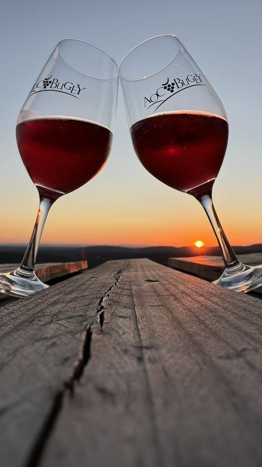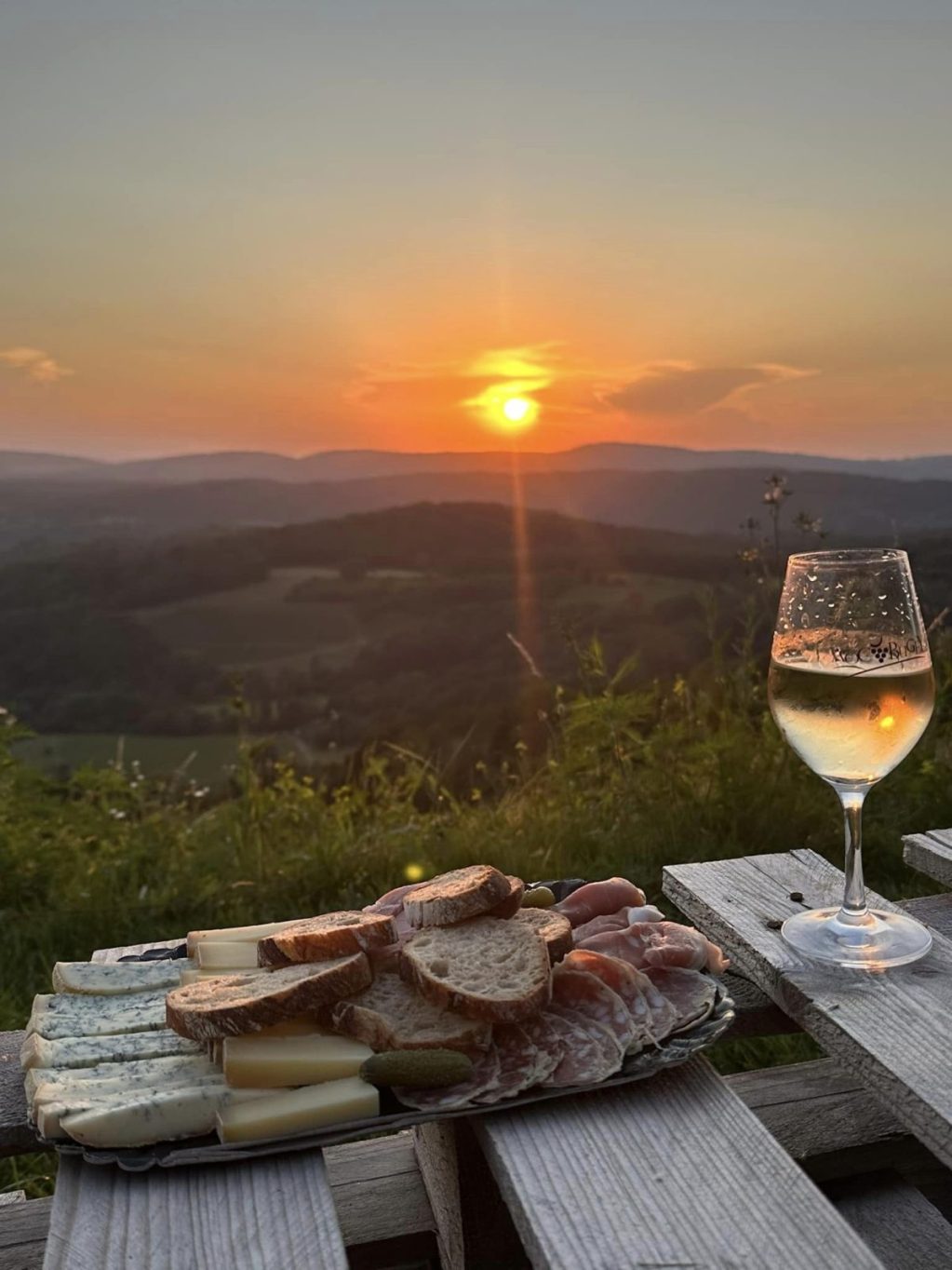 Après l’effort, le réconfort : dégustez 3 vins produits par Daniel autour d’un plateau repas Charcuterie / Fromage pendant le coucher de soleil avec vue sur la vallée de l’Ain.
