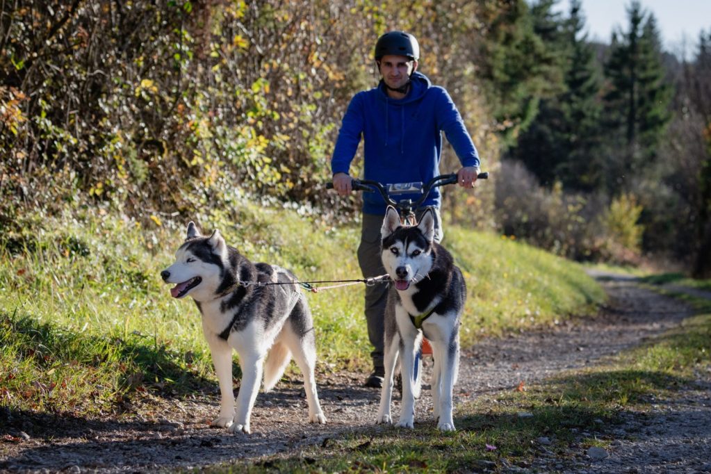 Une activité de plein air en trottinette accompagnée de deux chiens en attelage.