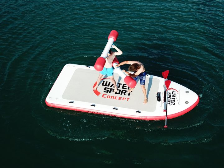 Combat avec cotons tiges géants gonflables sur paddle géant gonflable.