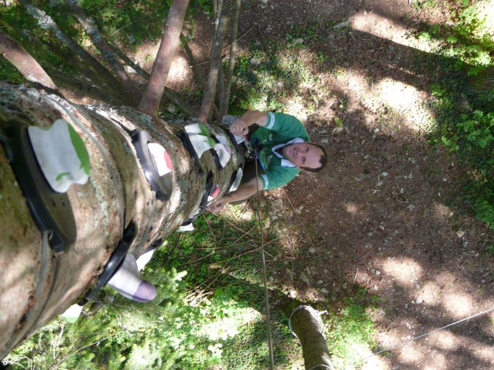 C'est vraiment de l'escalade - avec de vraies prises, fixées astucieusement sans blesser l'arbre - mais sur un épicéa pour atteindre les plus hautes branches. Saurez-vous sonner la cloche qui vous attend tout là-haut ? Un dispositif de sécurité automatique assure à la montée et à la descente.