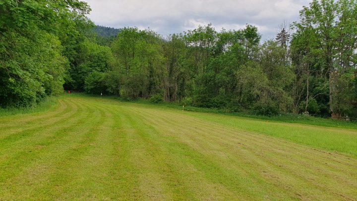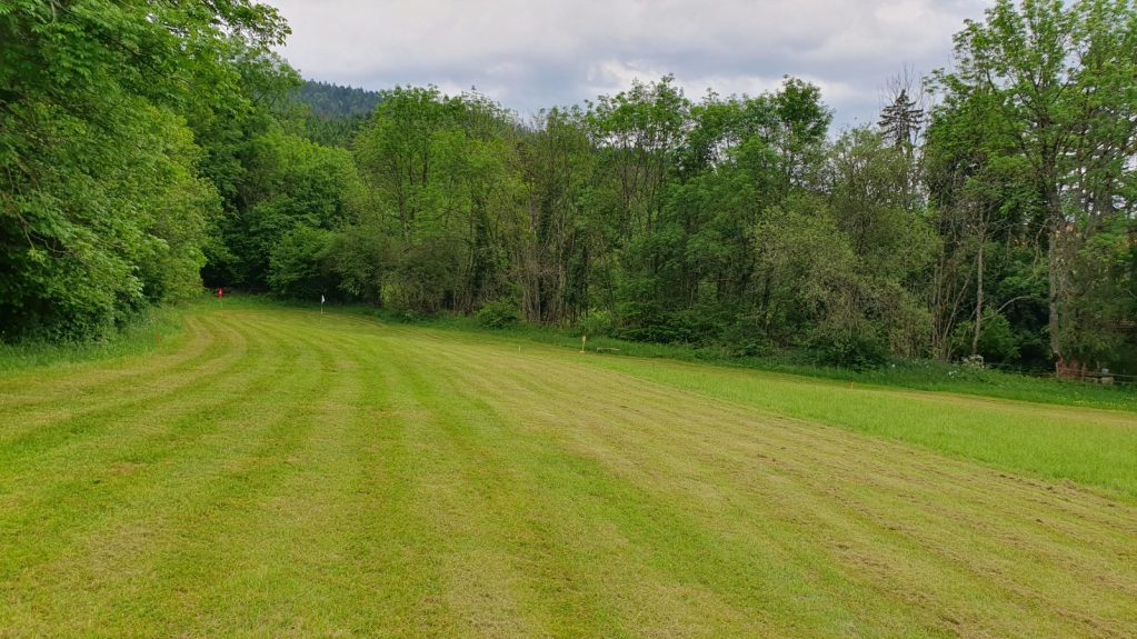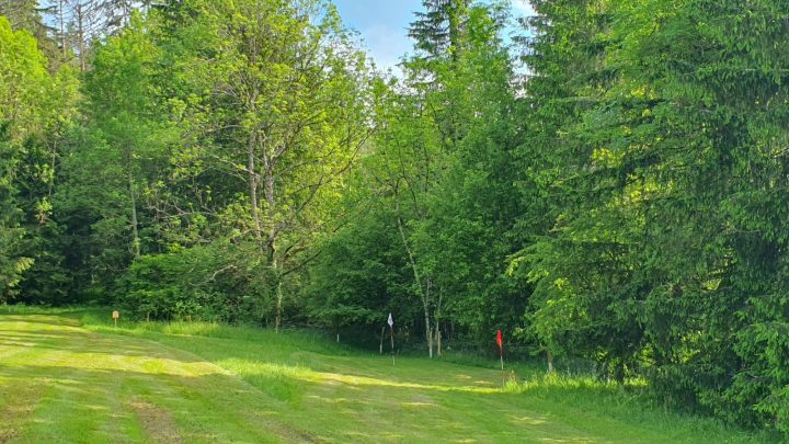 Le parcours est dessiné sur un terrain bucolique de moyenne montagne en conservant la topologie naturelle. Sa longueur est de 1200m, les 9 aires de jeu successives ont des longueurs de 70 à 240 m. Chacune se termine par une aire de drapeau qui présente un grand trou pour le foot muni d'un drapeau rouge.