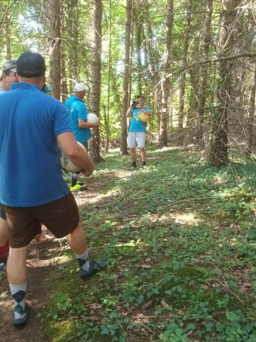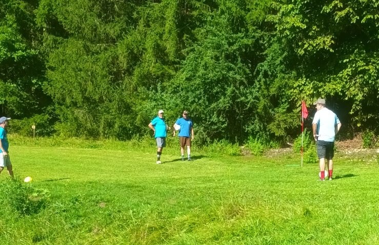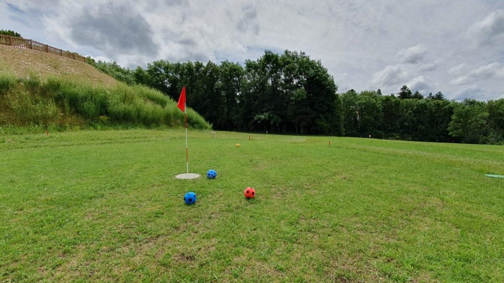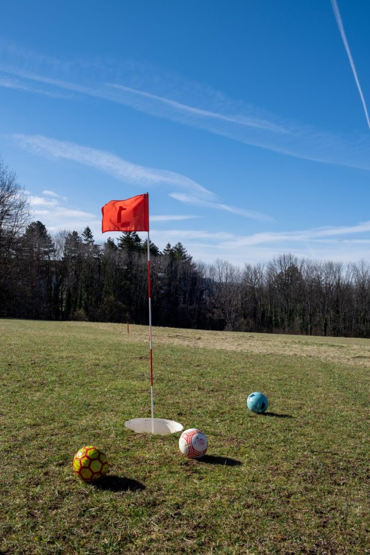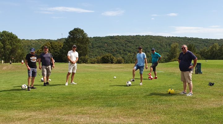 Pour le foot, sur les aires de départ les lignes de départ sont matérialisées par des pavés blancs, bleus et rouges dont la distance aux trous figure sur le panneau portant le N° du trou. Chaque joueur choisi sa ligne de départ en fonction de sa compétence.