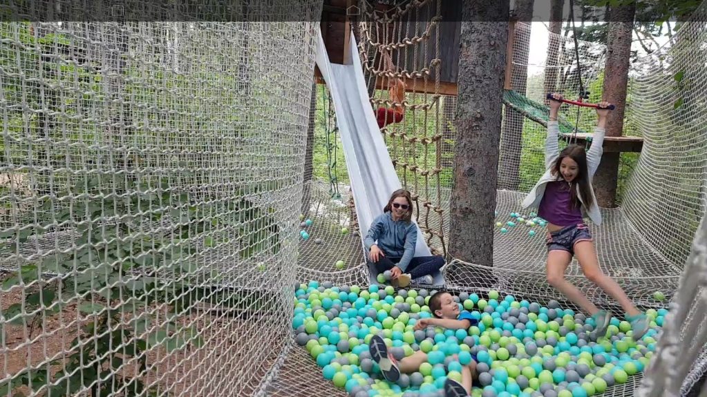Un espace filet entièrement sécurisé et spécialement conçu pour les enfants avec cabane, filet à grimper, tyrolienne et piscine à balle, permet aux parents de profiter d'un grand parcours pendant que les enfants s'amusent.