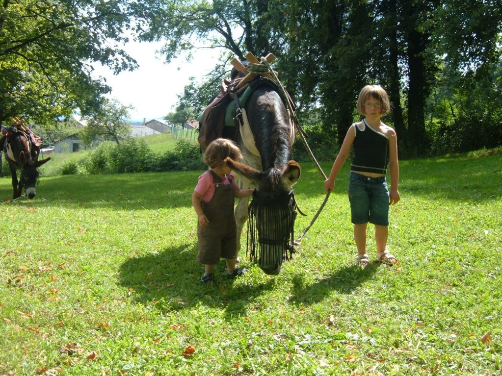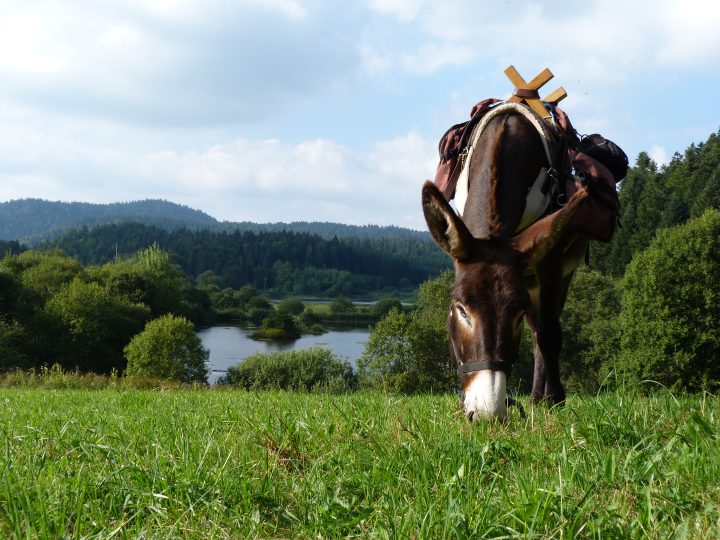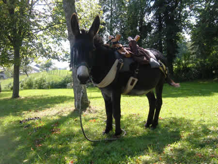 Equipés d’un tapis, d’un bât en bois et de sacoches, les ânes assurent le portage de vos sacs, pique-nique et enfants (maxi 30kg).