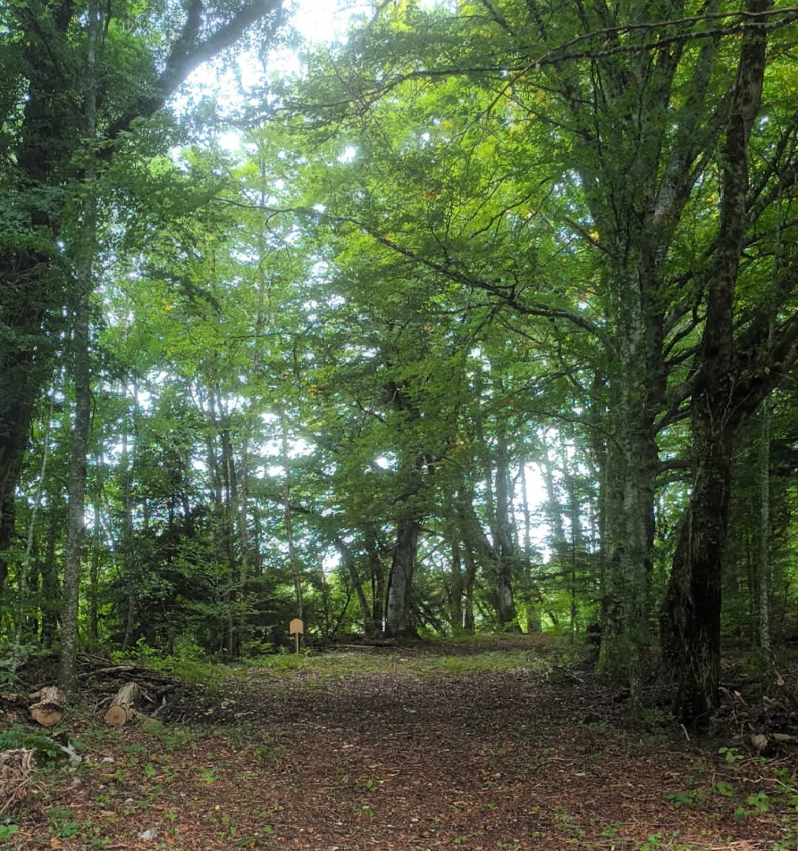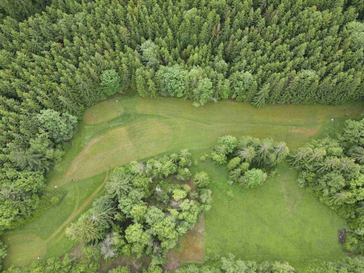 Le parcours insolite, dessiné sur un terrain bucolique de moyenne montagne, conserve la topologie naturelle du sol, sans arrosage ni pesticides. Sa longueur est de 1200m, les 9 aires de jeu successives ont des longueurs de 70 à 240 m. Chacune se termine par une aire de drapeau qui présente un trou pour le swin repéré par un drapeau blanc.