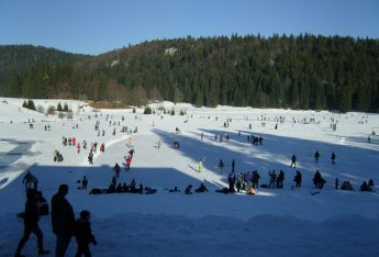 Lorsque l’hiver saisit les paysages et habille les grands sapins de cristaux scintillants, l’eau du lac se fige et gèle ! Les patins à glace sont de sortie, les joues rouges et les rires colorent le silence, les danseurs glissent sur le miroir naturel, virevoltent et s’amusent ! Le bal est ouvert !