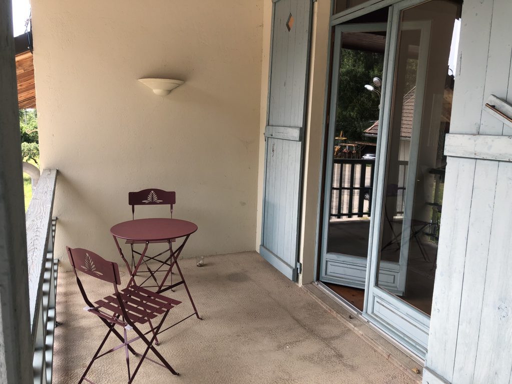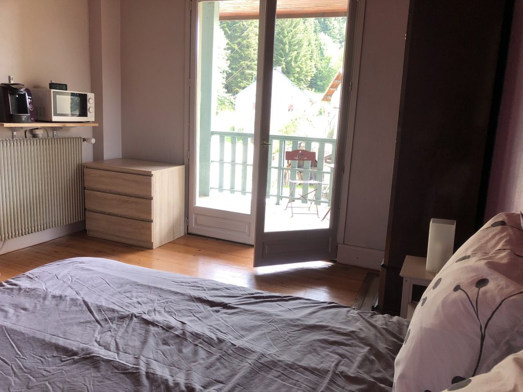 Chambre de 14 m² au 1er étage, tout confort (wifi gratuit, télé, cafetière, micro-onde), avec lit électrique en 140x190, salle de bain et wc privatifs, grand balcon. Frigo et congélateur à disposition.