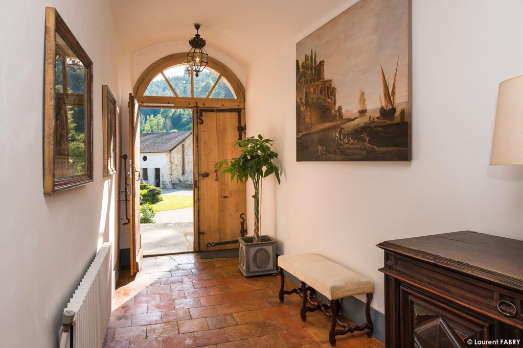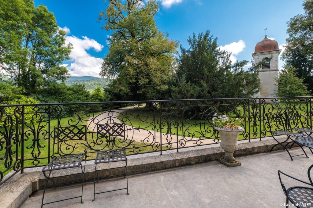 Meubles d'époque, parquets, cheminées, salon commun avec boiserie Louis XV ouvrant sur une terrasse avec vue sur les montagnes et le parc aux arbres bicentenaires.