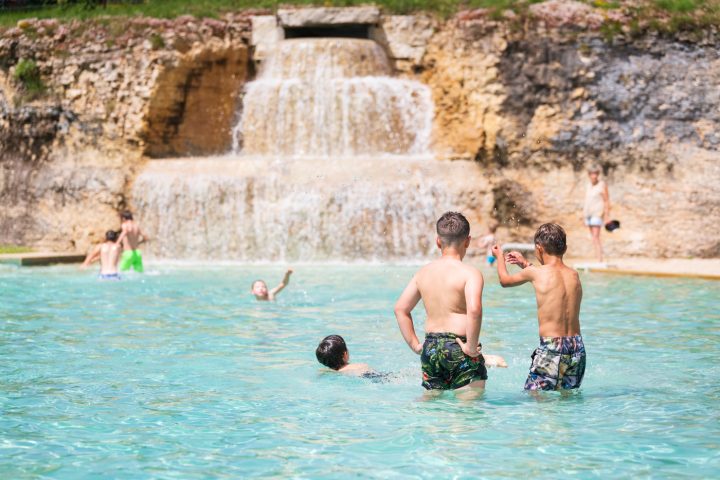 L'espace baignade surveillée et en plein air comporte un bassin de 2200m² de 10cm à 1,70m de profondeur, une plage aménagée, des jeux d'eau, la vente de glaces, bonbons, un toboggan, une cascade, la location de parasols...