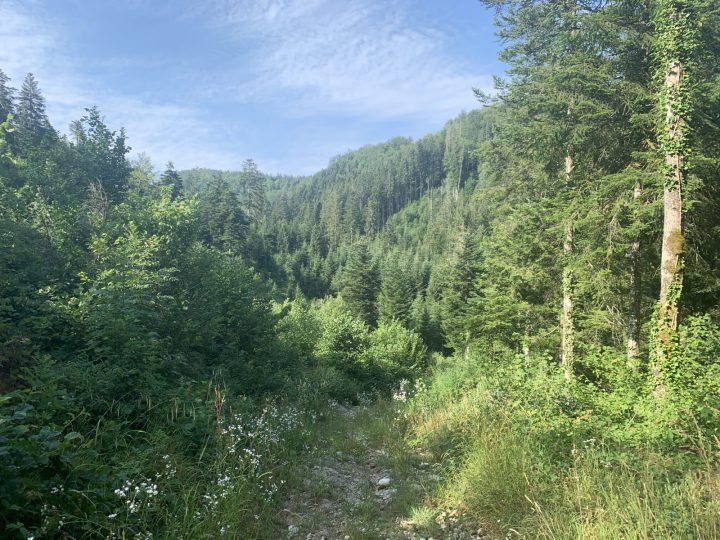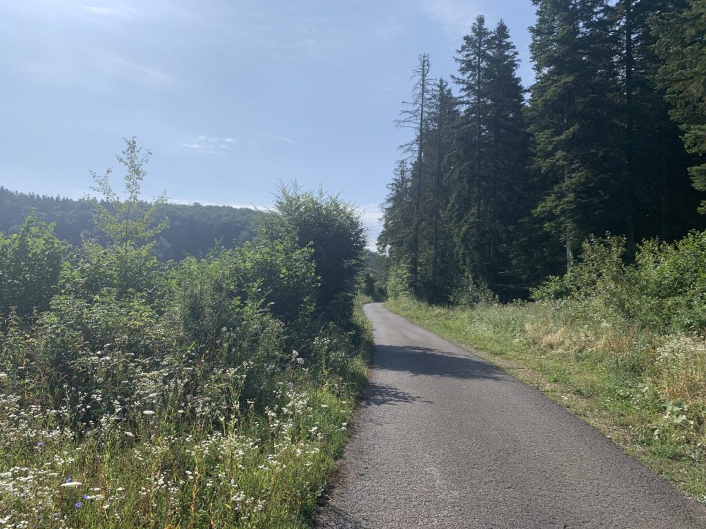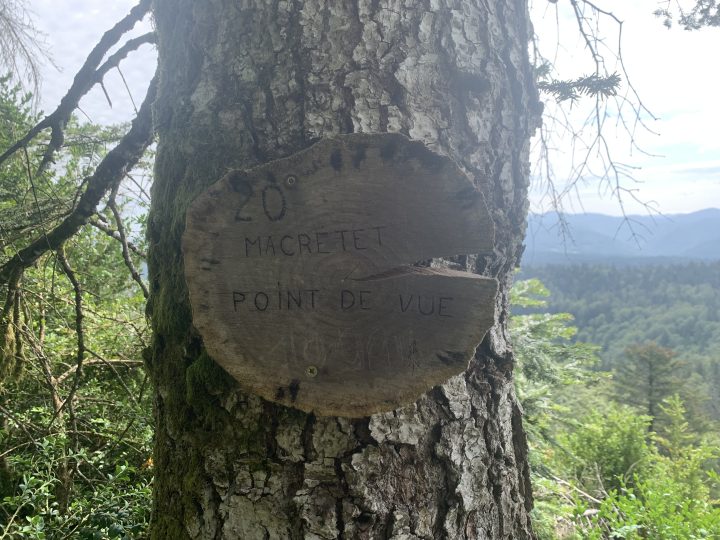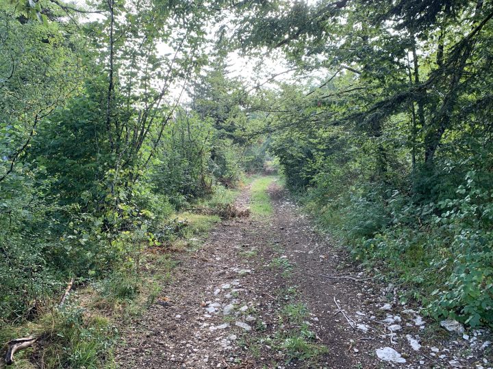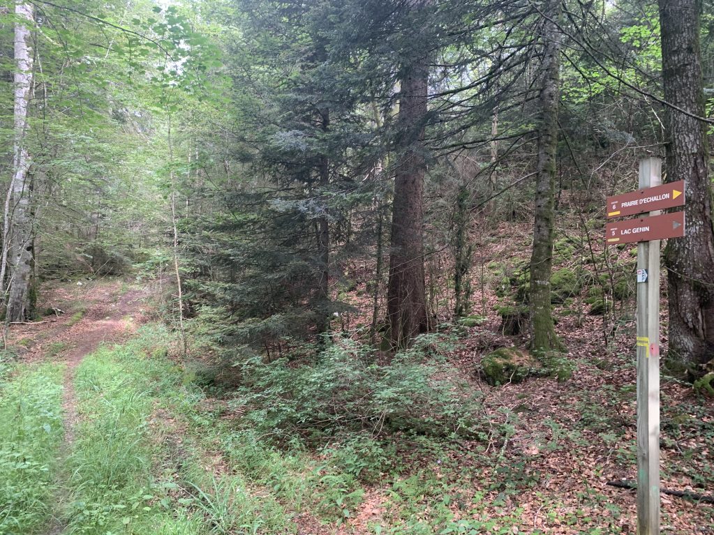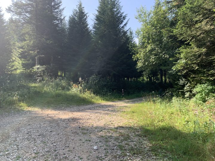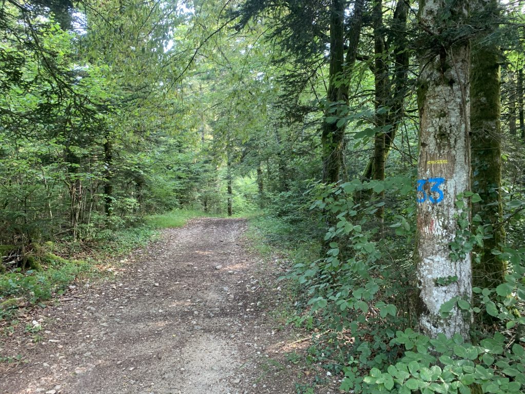 > Une fois arrivé à la route goudronnée lieu-dit "Poteau Mulevin" côté 724m, prendre tout droit direction Collet de Chatel. Suivre sur la route forestière de Longecombe.