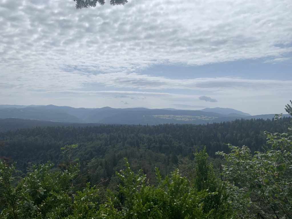 > Dans la descente continuez de suivre la direction Marchon, vous traverserez une première route forestière empierrée puis une fois arrivé sur la route goudronnée, prendre à droite jusqu'au "poteau Mulevin" côté 724 m, puis à gauche pour reprendre l'itinéraire du début et rejoindre la place de Marchon.