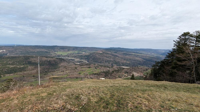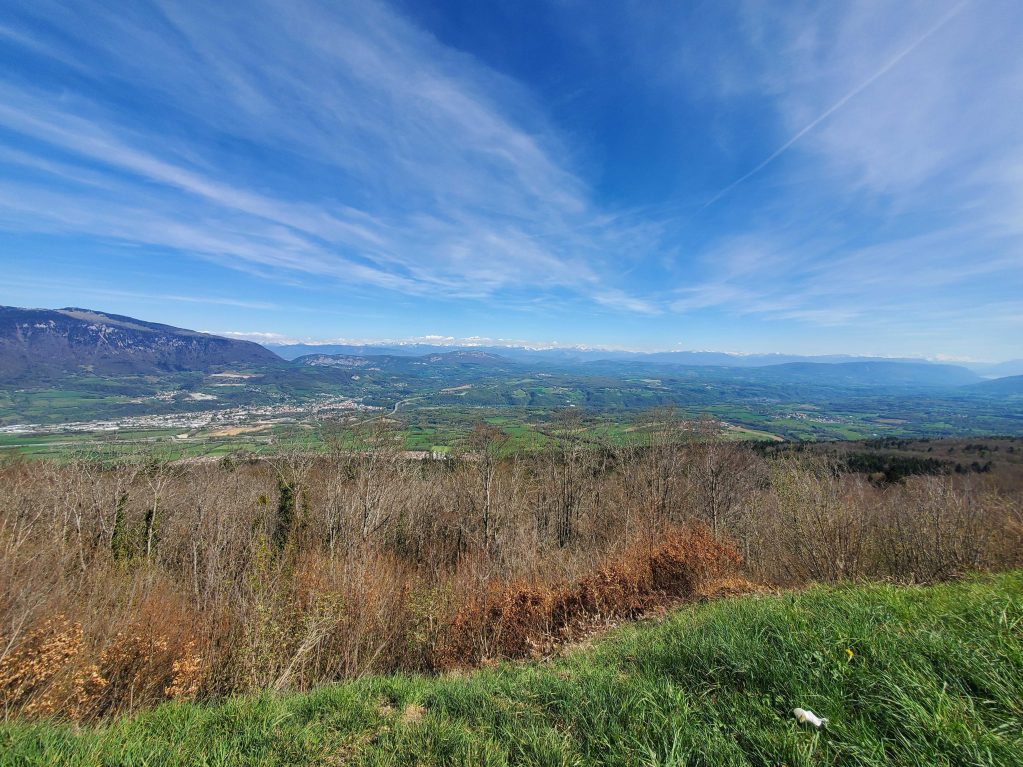 Arrivé à l’air de décollage des parapentes, on profite d'une vue panoramique sur la chaîne du Jura, les Alpes et le Mont Blanc, le Poizat, Lalleyriat et l’autoroute de Titans.