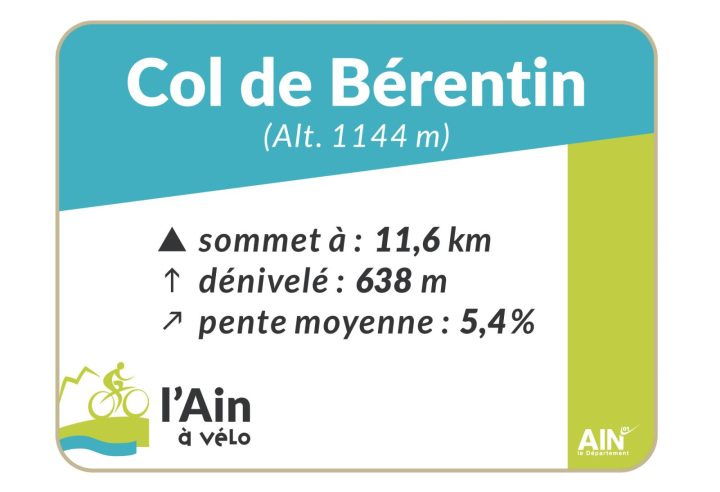 En partant du lieudit « La Voûte » sur la commune de St Germain de Joux, vous grimpez le Col de Bérentin (1 144 m) par le versant nord, à travers la forêt de résineux et de feuillus. Direction Lalleyriat par la D 55 vous rejoindrez le village du Poizat, site dédié à la pratique du ski nordique l’hiver. 5 km plus haut vous franchirez le col de Bérentin qui rallie la vallée de Nantua avec les hauts plateaux du Bugey. Une montée régulière de 12 km mais assez pentue avec un % maxi à 6.8 % avec très peu de circulation.