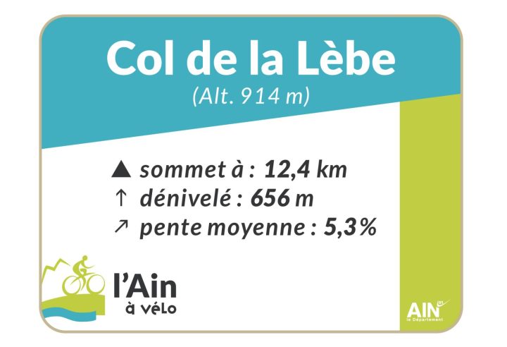 Le Col de la Lèbe (914 m), aux abords du Plateau d’Hauteville, propose une montée très agréable sans difficultés majeures (5,3 de % moyen de pentes) sur une route de bonne qualité. Cette ascension de 12,4 km depuis Artemare (versant Est) vous conduit de la basse vallée au plateau du Bugey, en traversant les prairies du Valromey. Dans un cadre champêtre, avec Le Grand Colombier en toile de fond à l'est vous passerez quelques épingles offrant une vue sur l'avant Pays Savoyard et les Alpes. Sur la route du col à 1 km du sommet se trouve l’Observatoire de la Lèbe, espace scientifique d’exploration, de jour et de nuit, ouvert à tous les publics. Accordez-vous une pause en redescendant .