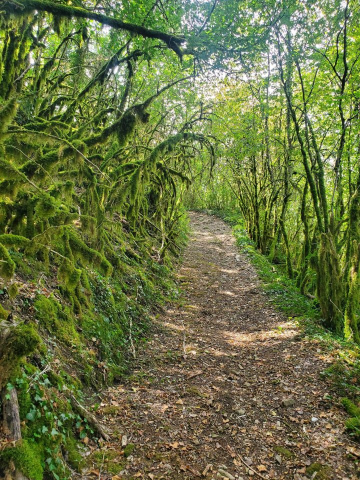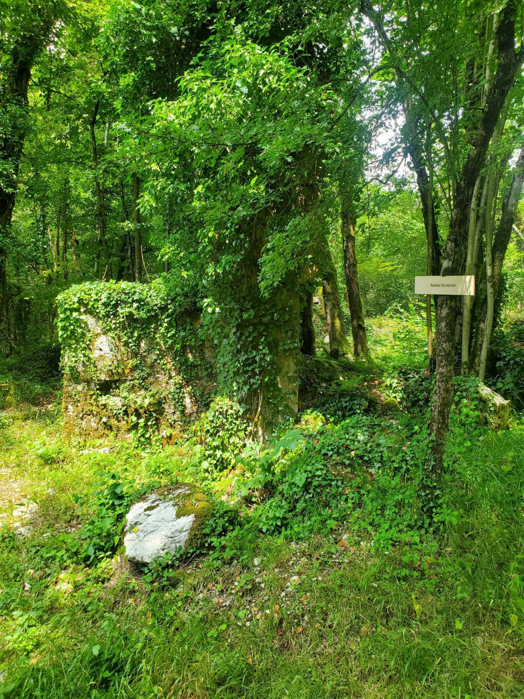 Cette randonnée pédestre balisée en jaune prend départ le petit village de Bombois. Le sentier forestier permet une bifurcation jusqu'à la cascade de Pisse-Vache (+20 mn) et monte fortement en direction d'Heyriat. Après avoir traversé le village, le sentier se poursuit entre champs et forêts jusqu'aux ruines de Vernon. Il redescent ensuite jusqu'à Granges puis rejoint Bombois en suivant la rivière d'Ain