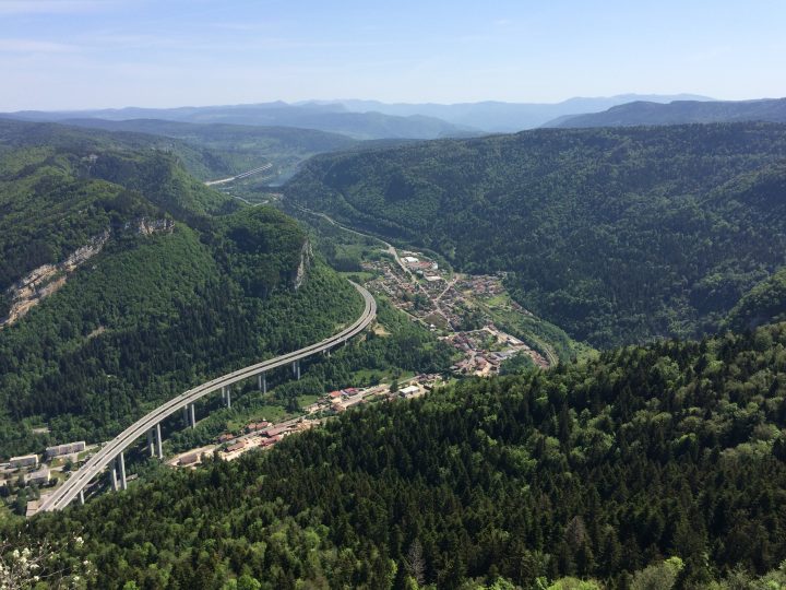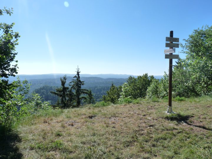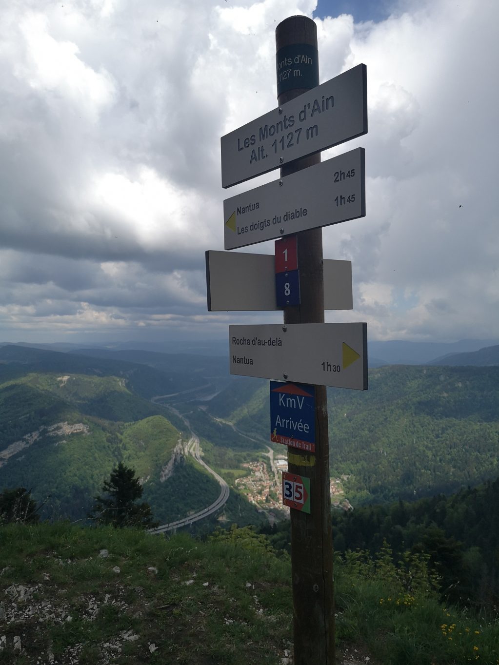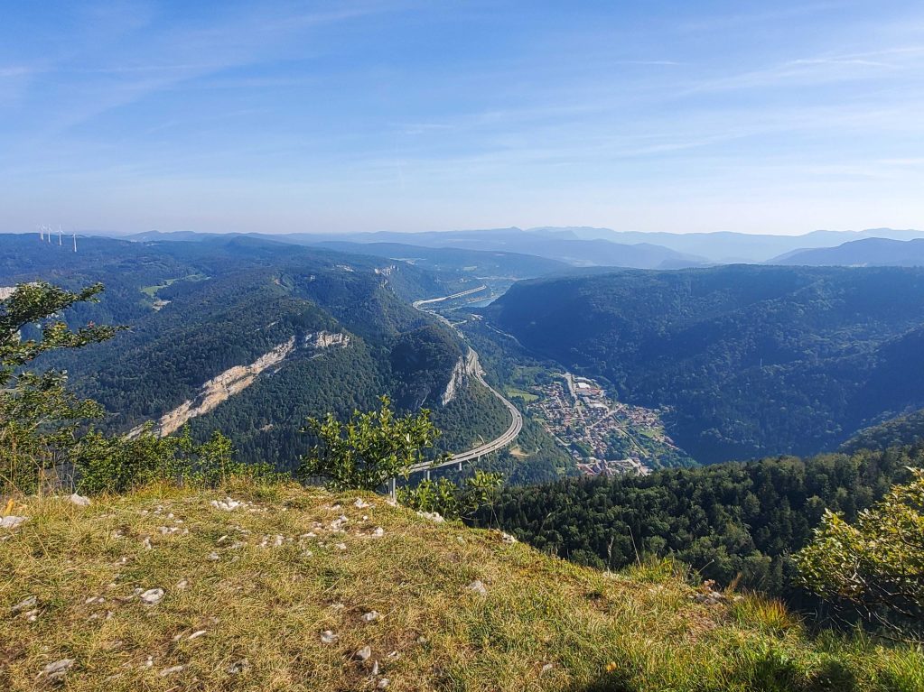 4.Laisser le chemin raide et prendre à droite. La pente s'accentue. En haut de la montée, laisser le chemin à gauche. Après un léger replat, le chemin emprunte une nouvelle montée (le panorama des Monts d'Ain se mérite !) puis le chemin se transforme en sentier. Contourner l'arbre couché en travers. Un point de vue est indiqué sur la droite. Bien suivre le balisage par rectangles jaunes. Reprendre le sentier qui monte et serpente entre les arbres. Rejoindre un chemin et le prendre à droite. Encore une montée raide (mais la récompense est au sommet). Attention à ne pas manquer la bifurcation du sentier à droite (pas de panneau mais du balisage peinture) qui mène à une prairie de toute beauté.
