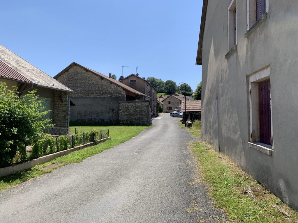 Passer sous la ligne électrique à haut tension et emprunter le chemin à gauche qui ramène à Prémillieu et la place de la mairie.
