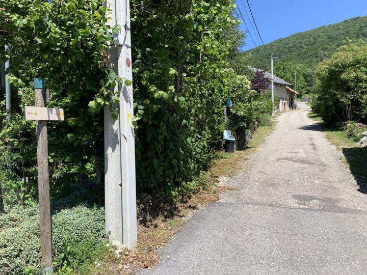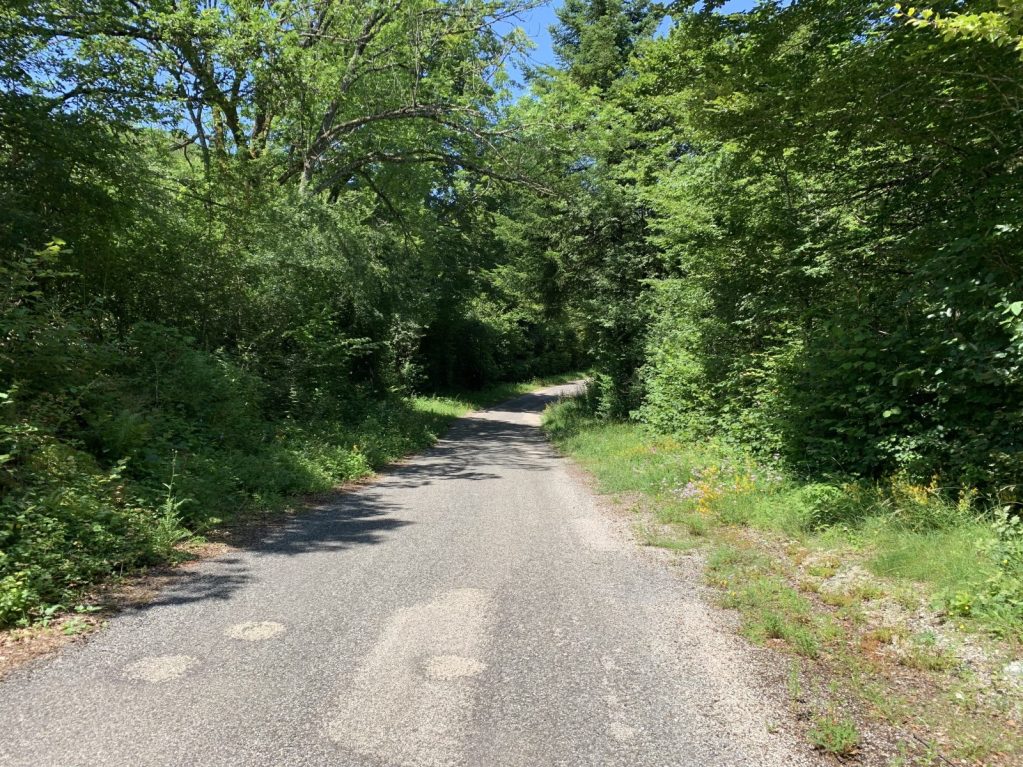 Emprunter alors le chemin creux immédiatement à droite qui coupe les lacets de la route et la rejoint après 300 m. Suivre la route dans le prolongement du chemin quitté sur 1.3km environ.