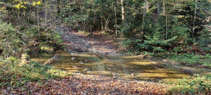 Au croisement vers le point 558m, prendre à droite sur 400m pour retomber sur une route forestière empierrée et la descendre.