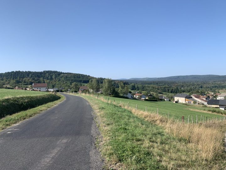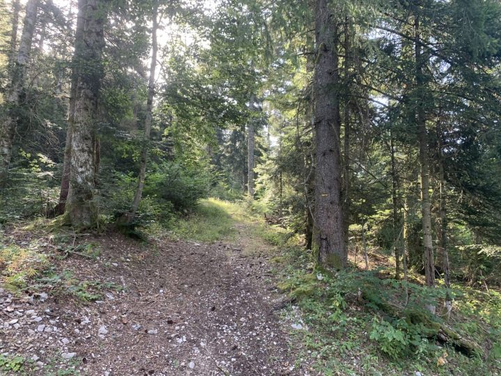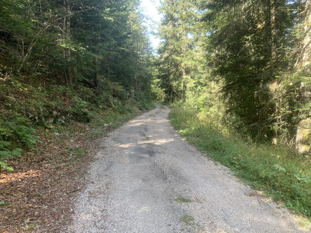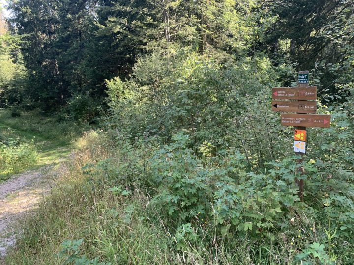 Basculer derrière la bute et emprunter par la gauche le chemin empierré (piste rouge de ski de fond). Au croissement avec la piste forestière empierrée, prendre à gauche. La suivre jusqu'à Montfalcon (environ 1.5km).