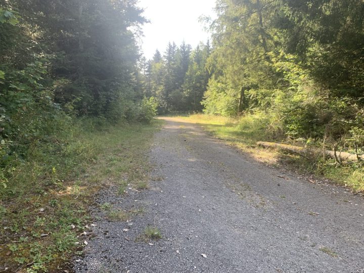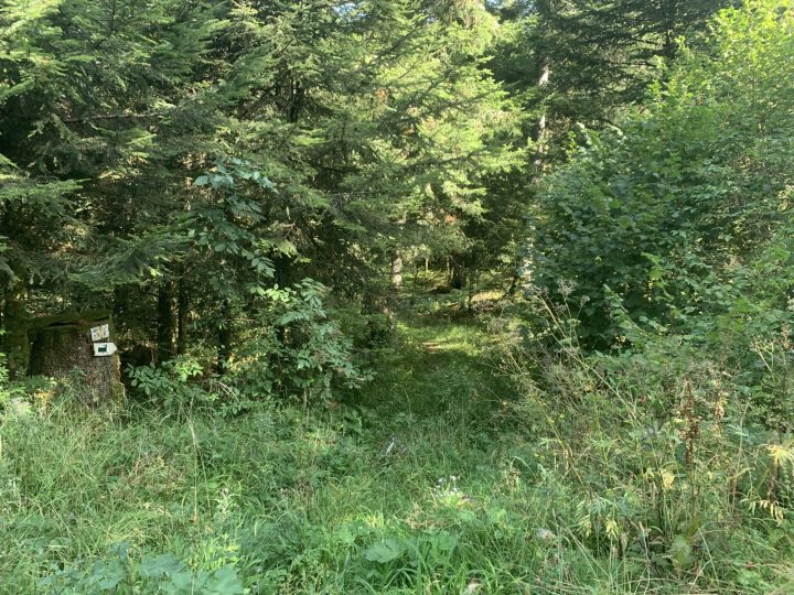 Suivre alors sur la droite une large piste forestière qui s'enfonce en foret dans le prolongement de la route quittée. Elle monte en pente plus ou moins raide pour déboucher sur une place. Des trois chemins repartant de la place, prendre celui du milieu jusqu'à atteindre la route forestière goudronnée. La traverser et continuer en face le chemin qui monte en pente parfois très raide.
