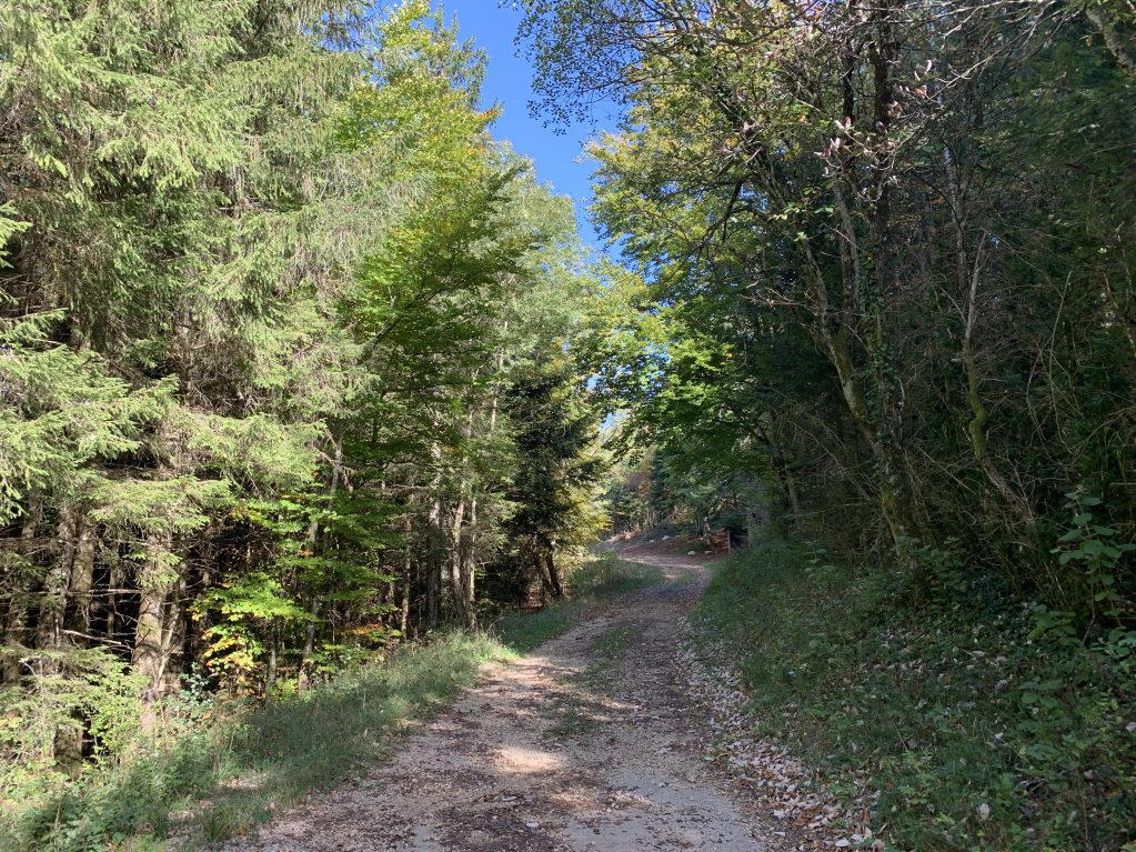 Quittez la petite route et traverser successivement des prés et bois avant de redescendre sur le versant d'Alex.