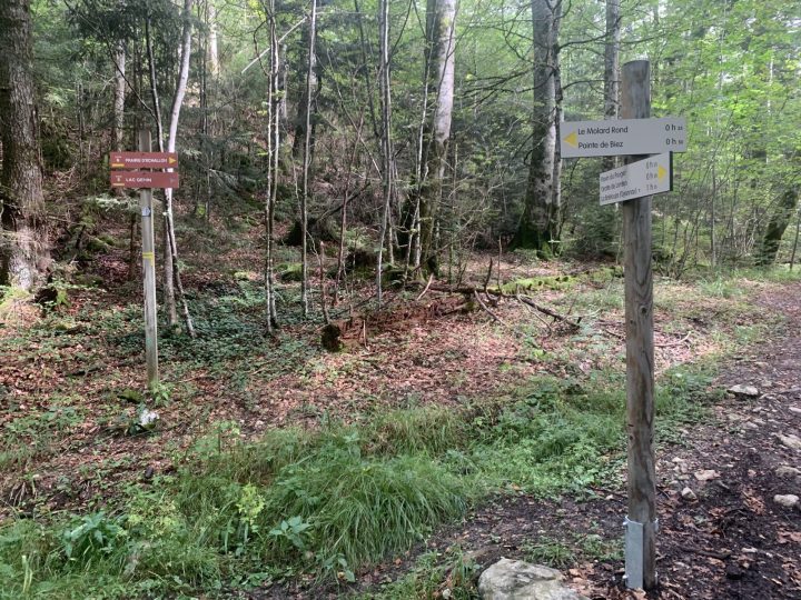 Au carrefour, prendre un sentier sur la gauche et traverser un petit vallon. En haut du versant opposé, partir à gauche pour gravir un sentier sinueux, assez raide et aménagé. Au point culminant du sentier, prendre à gauche monter vers le Mollard-Rond (1088m).