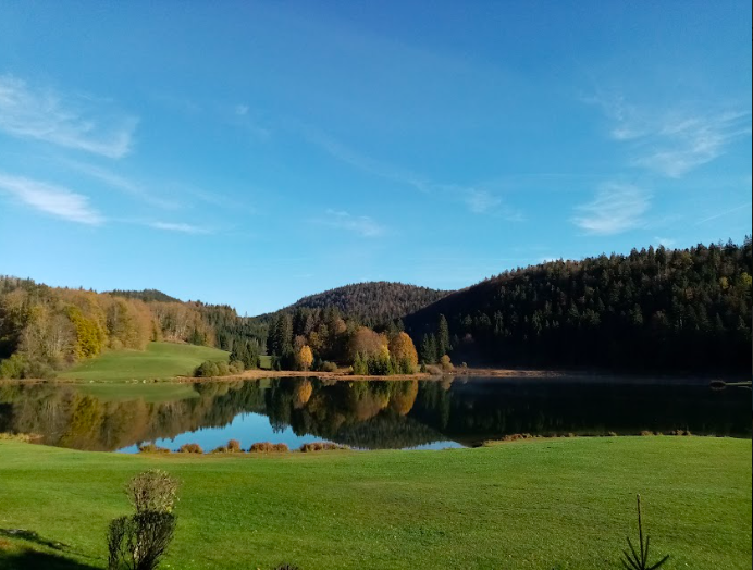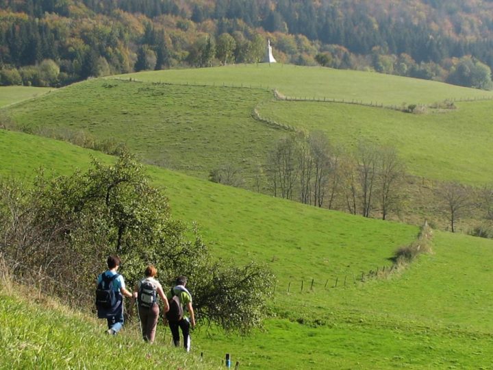 Du terrain de jeux, prendre la route qui longe une strabulation et contourne le mamelon sur lequel se tient la statue de la Vierge du Chauffon. Au sommet de la montée, suivre la route à gauche. Au terme d'un replat, prendre le chemin forestier à droite sur 350m.