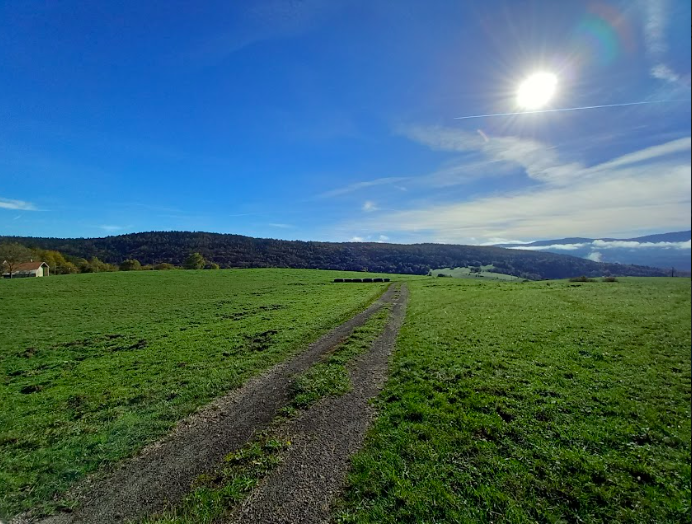 Emprunter le chemin de terre à gauche. D'abord en montagnes russes, il descend ensuite dans la combe. Prendre à gauche sur 50m.