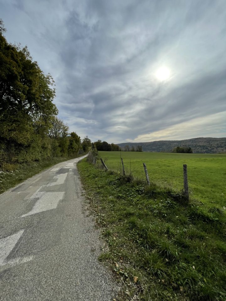 10. Au bout de cette place, au début de la route goudronnée, prendre à gauche un petit sentier qui descend en pente raide sur Thézillieu.