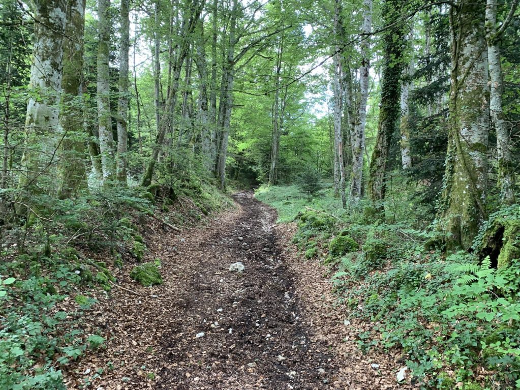 Après le col, emprunter à droite un large chemin forestier. Passer sous une ligne à haute tension et poursuivre en forêt jusqu'à un virage serré.