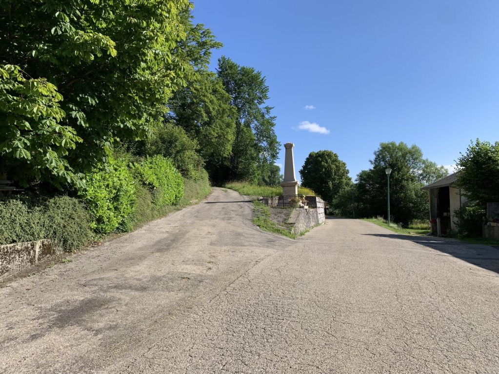 12. Après un coude à 90° à gauche dans le village, tourner à droite pour suivre une route qui mène en pente raide, à un lotissement, le contourner par la droite pour reprendre la route jusqu'au pied de la Vierge et suivre le chemin qui démarre en face entre deux maisons et s'enfonce en forêt.