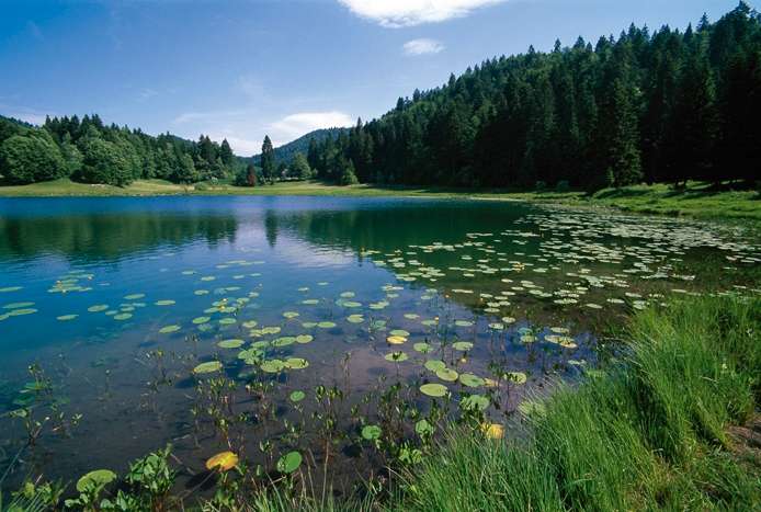 Été comme hiver, les Oyonnaxiens l’adorent. Surnommé « Le Petit Canada du Haut-Bugey », ce lac de combe bordé de prairies et de sapins, situé à quelques minutes de la ville, cumule tous les loisirs : baignade, VTT, randonnée, sans oublier les plaisirs du pique-nique et du farniente