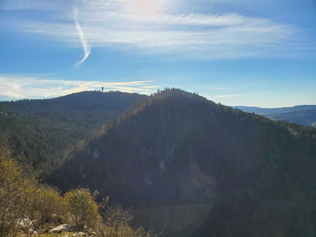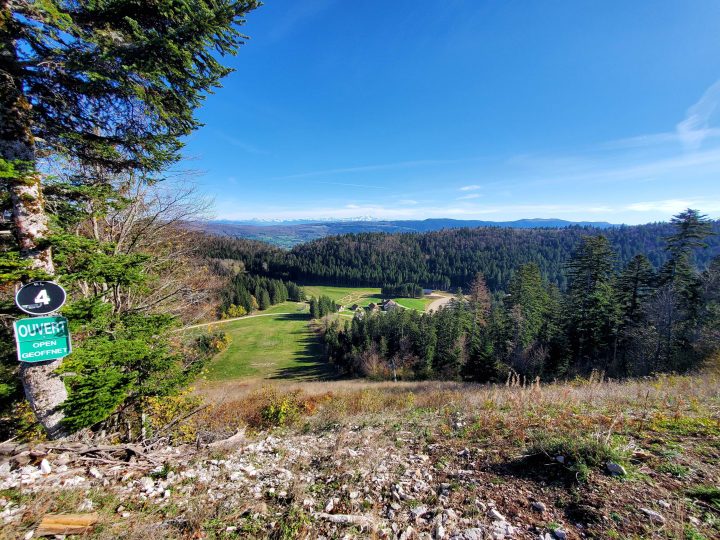 4. Longer la crête par la gauche, passer sous le pylône du téléski et redescendre sur 50 m environ en longeant le câble. Emprunter dans le fond du vallon vers la droite le chemin tout d'abord puis la piste forestière empierrée ensuite qui descendent en sinuant jusqu'à la route forestière de la combe à Brazier qui démarre juste en face.