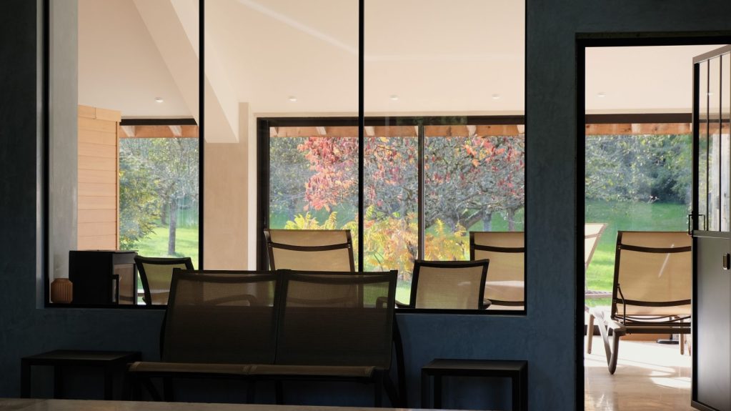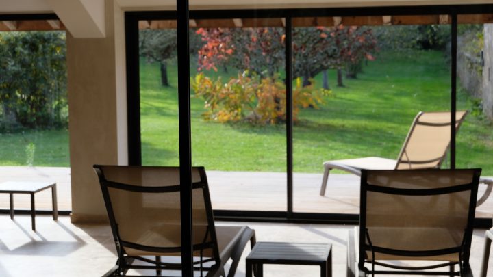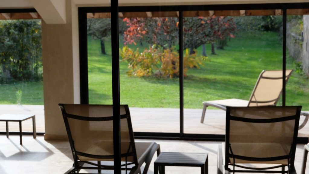 Aux beaux jours, la baie vitrée coulissante donne accès à une terrasse en bois face à un verger pour profiter d'un bain de soleil confortablement installé dans un transat.