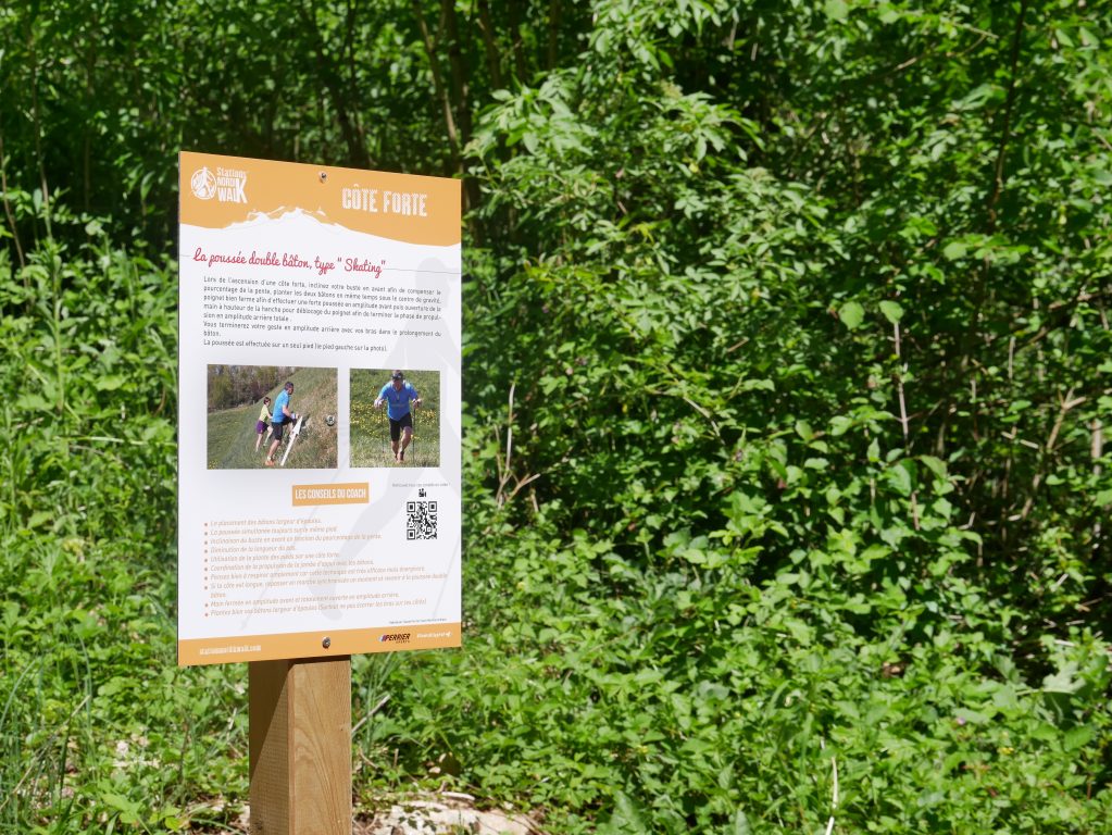 La Destination marche nordique Haut-Bugey Montagnes du Jura propose des parcours spécialement étudiés pour la pratique de la marche nordique, dotés de balises spécifiques numérotées et marquées d’une couleur symbolisant la difficulté (vert, bleu, rouge, noir). Dans le Haut-Bugey, ces parcours de 4,7 à 15,3 km sont ponctués d’ateliers d’entraînement à utiliser en autonomie grâce à un panneautage avec QR codes renvoyant à de courtes vidéos de démonstration : côte forte, fractionné, franchissement d’obstacle et technique de descente.