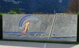 La mosaïque monumentale L’Esprit du lac, réalisée d’après un dessin de GRATALOUP, visible à droite de l’entrée de l’Office de Tourisme du Haut-Bugey