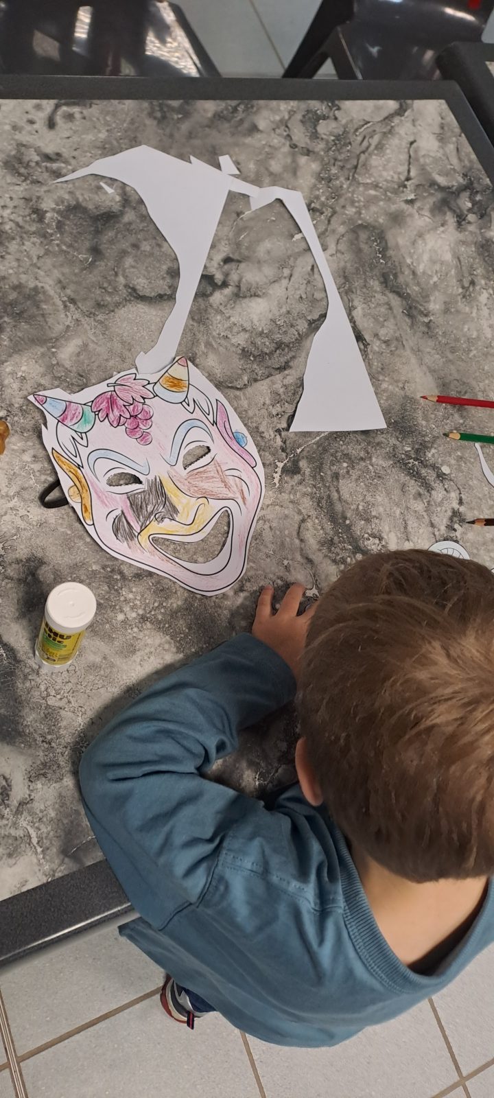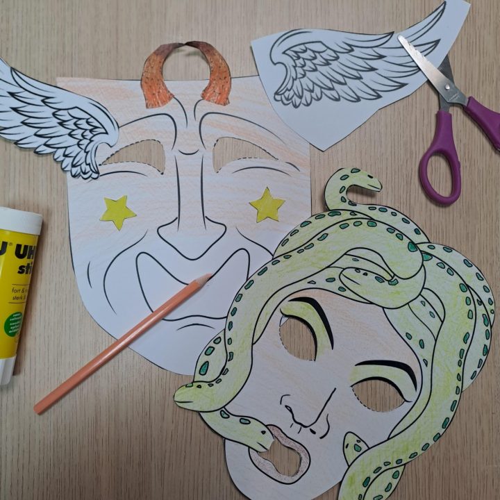 Puis vient le moment de créer : chaque enfant décore son propre masque de théâtre, en s’inspirant des modèles antiques ou en laissant libre cours à son imagination !