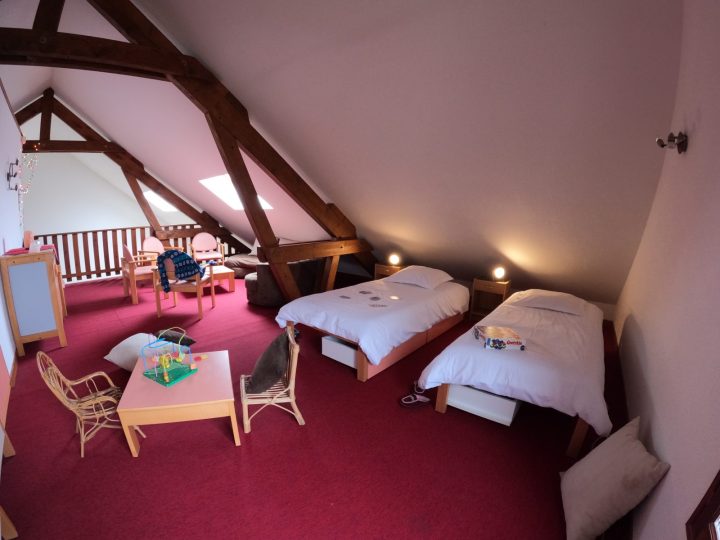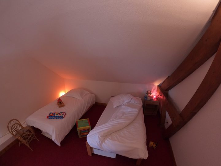 Au 2ème étage : Une grande mezzanine avec un coin nuit pour 4 personnes, un coin détente avec bibliothèque et jeux à disposition et un WC.