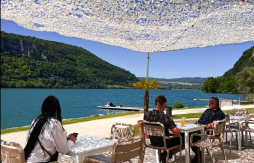 La Voile Blanche offre un cadre idyllique pour profiter d’un repas ou d’un cocktail face au lac. Sa terrasse ombragée sous de grands arbres est accessible directement depuis la piste cyclable ViaRhona, ce qui en fait une halte remarquable pour les cyclotouristes ou promeneurs.