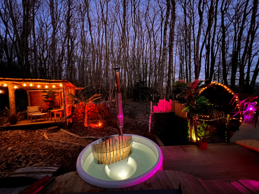À l’extérieur, profitez d’un coin repas abrité, de transats, de fauteuils suspendus, et d’un espace aventurier autour d’un feu de bois. Ajoutez une touche de divertissement à vos moments de détente avec des jeux de fléchettes, ou relaxez-vous dans le salon de jardin extérieur. Vos petits-déjeuners seront livrés discrètement chaque matin pour débuter la journée en toute tranquillité.