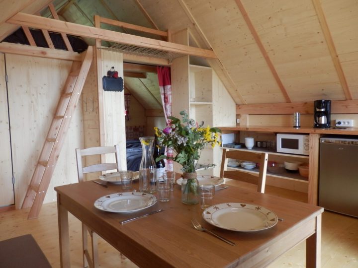 Entièrement équipées pour 4 personnes (vaisselle, réfrigérateur, plaque induction, cafetière, micro ondes ..), une chambre avec un lit double et un couchage en mezzanine avec 2 lits simples : les enfants apprécieront de monter à l'échelle de meunier pour rejoindre leurs lits, un coin cuisine/repas, salle de douche / toilette et superbe terrasse couverte tout ça dans une ambiance particulièrement chaleureuse.