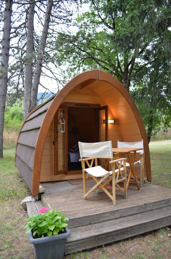 Cabanes en bois toutes en rondeur de 9m2, les cabanes Pods originales sont équipées d'un lit de 140 et d'un aménagement intérieur "douillet". Une terrasse équipée permet de profiter de l'extérieur et du calme des lieux.