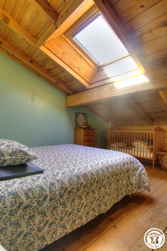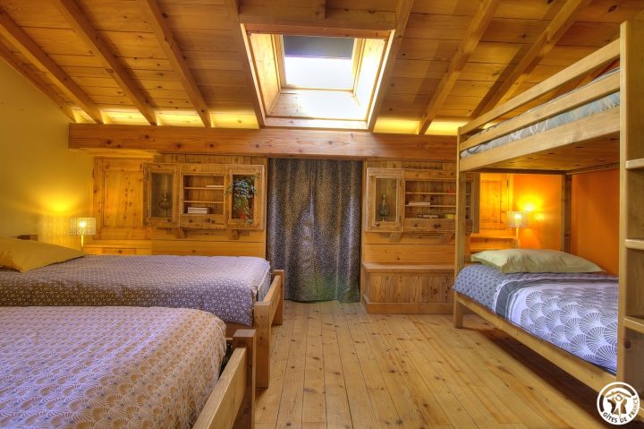 Au niveau de la grange : local pour le bois ainsi que pour vélos et skis. Entrée du gîte vers les chambres : 1 petite chambre double + une grande chambre pour 4 personnes avec dressing.