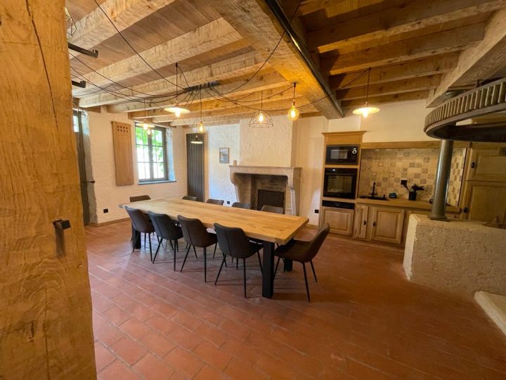 Gîte de 6/8 personnes : 150 m². Au RDC : 1 cuisine, 1 salle à manger, 1 WC avec lavabo. Au 1er étage : 1 coin salon avec télévision et jeux de société (canapé convertible pour 2 personnes + fauteuils), 1 chambre de 11,70m² (lit de 160X200, 1 télévision). Au 2ième étage : 2 chambres (de 12,30m² et 13,10m², lit de 160X200, 1 télévision dans chaque chambre), 1 salle de bain (composée d’un WC, d’une baignoire et d’une douche à l’italienne).