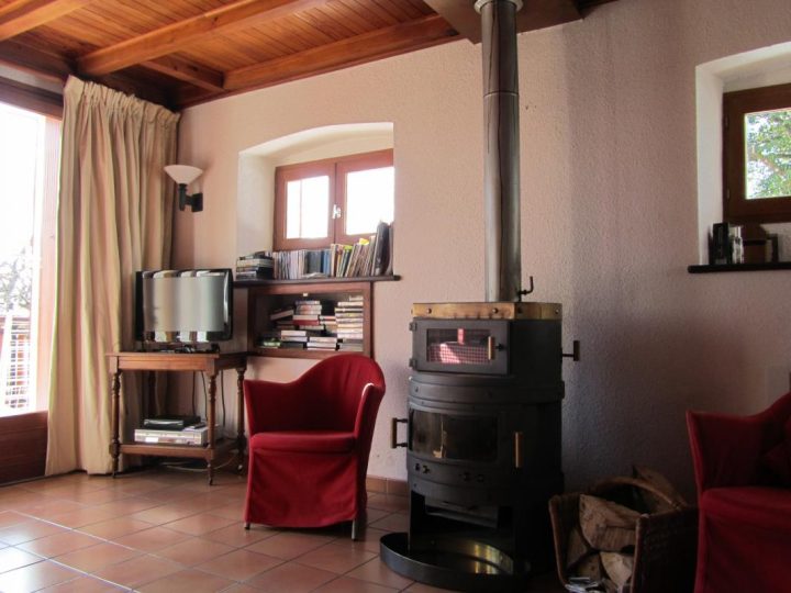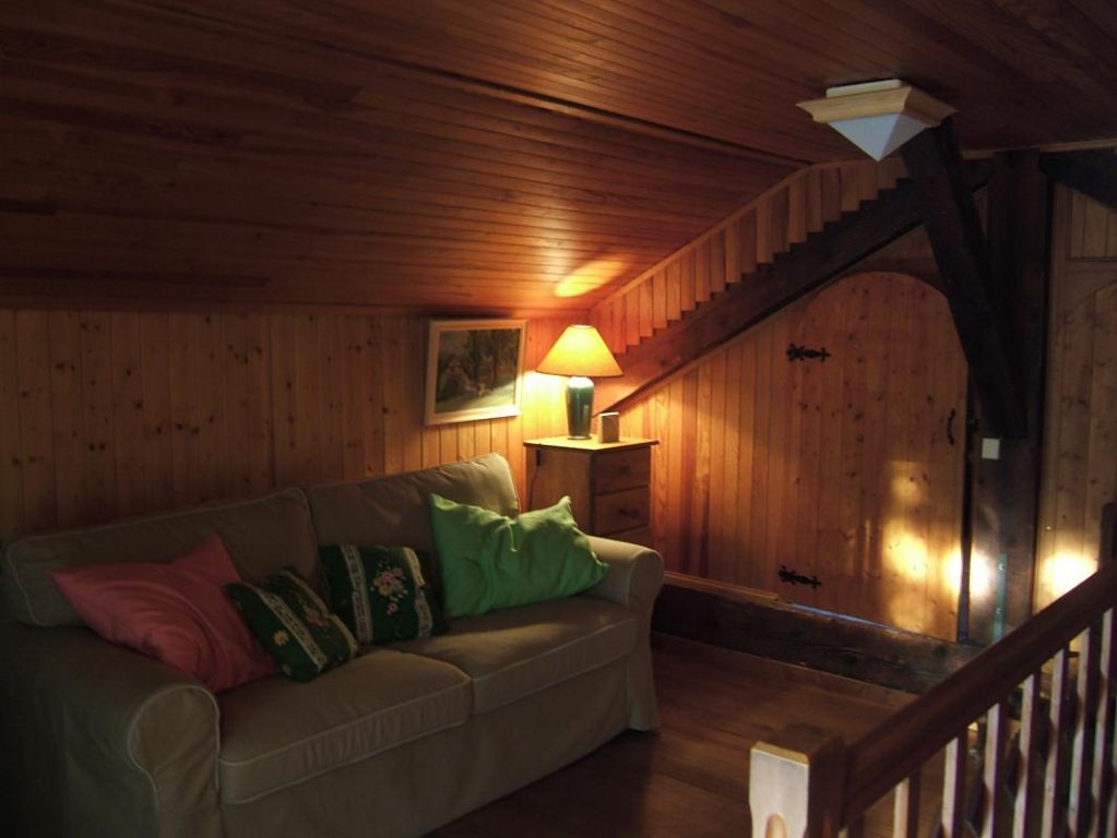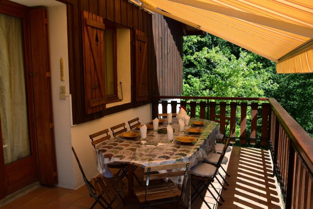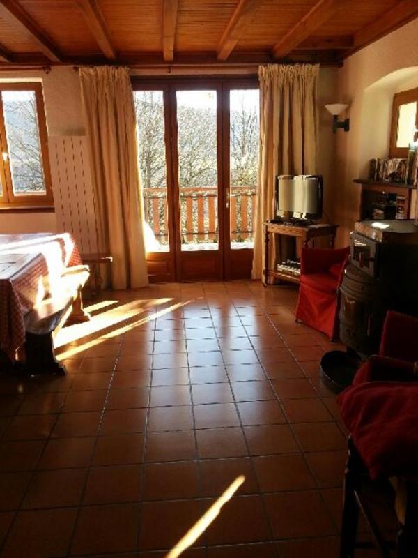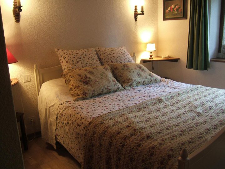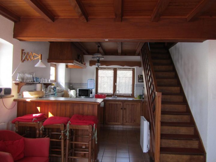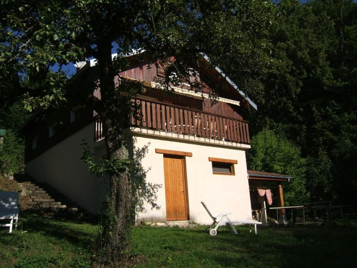 Maison totalement indép. sur 2 niveaux (100 m²) avec belle vue. Au r.d.c. : séjour/cuisine américaine (petit congél, lect DVD) et coin-salon, salle d'eau, 2 ch (2 lits 2 pers dont 1 de 160 cm). A l'étage : mezzanine et 1 ch (2 lits 1 pers, lit BB). Chauf. élect. + poêle-cheminée (bois en suppl). Terrasse avec salon de jardin. Tennis de table. Terrain mi-clos arboré. Parking.