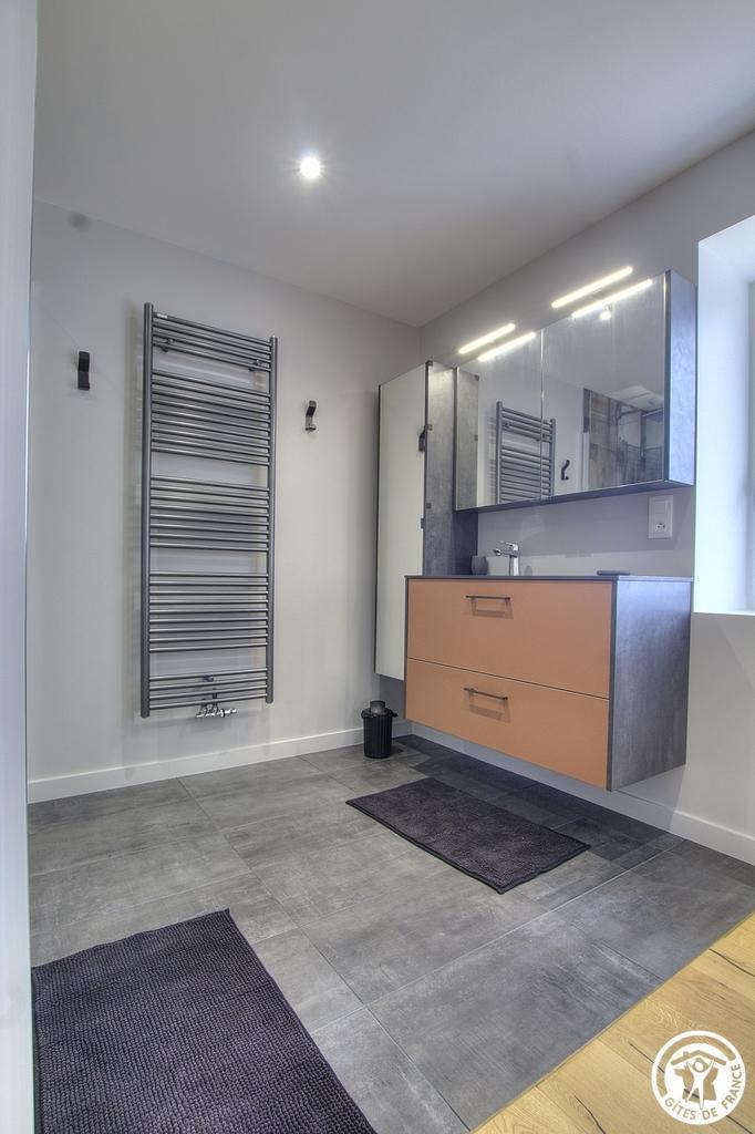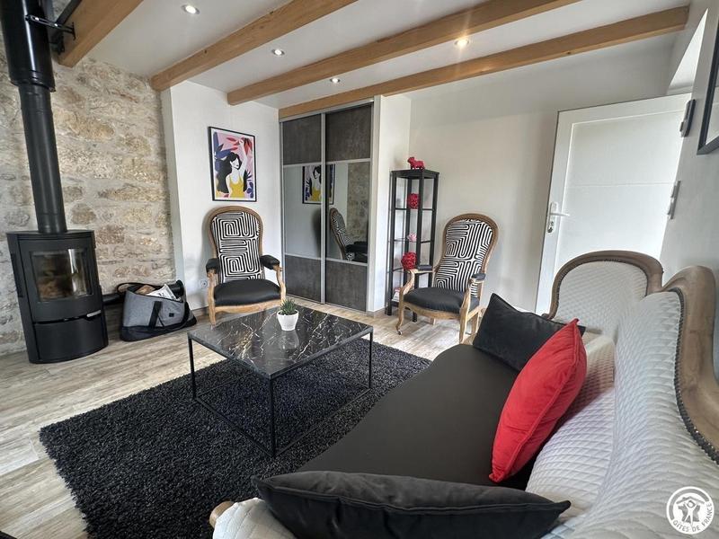 Le gîte de la Mine (50 m²): au rez-de-chaussée, vous trouverez un salon lumineux équipé d'un poêle à bois pour des soirées conviviales. Quelques marches plus bas, une cuisine moderne et entièrement équipée s'ouvre sur une vaste terrasse de 100 m² exposée plein sud, parfaite pour savourer la tranquillité et la beauté des lieux. Une salle d'eau avec douche à l'italienne et WC intégré complète ce niveau.