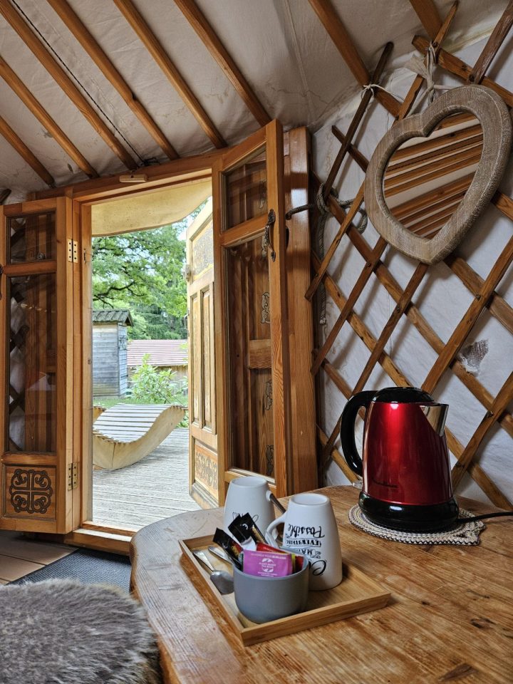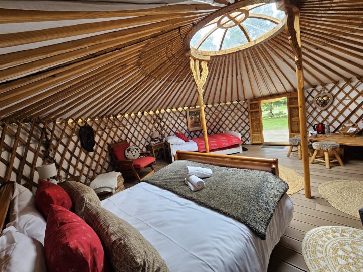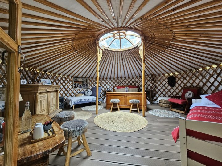 Cette Yourte Mongole traditionnelle de 27m2 offre tout le confort d’une chambre d’hôtes (literies confortables, couettes douillettes, chauffage si nécessaire,…).